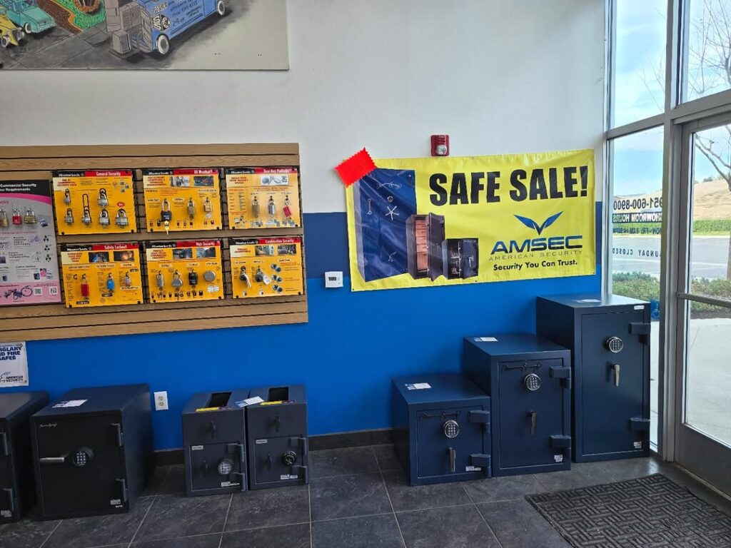 This is a physical retail location with safes on display—not an online-only seller or call center. Conveniently located near I-15, our Murrieta location offers new, used, and consignment safes, including American Security (AMSEC) gun safes, fire safes, home safes, and commercial safes.
